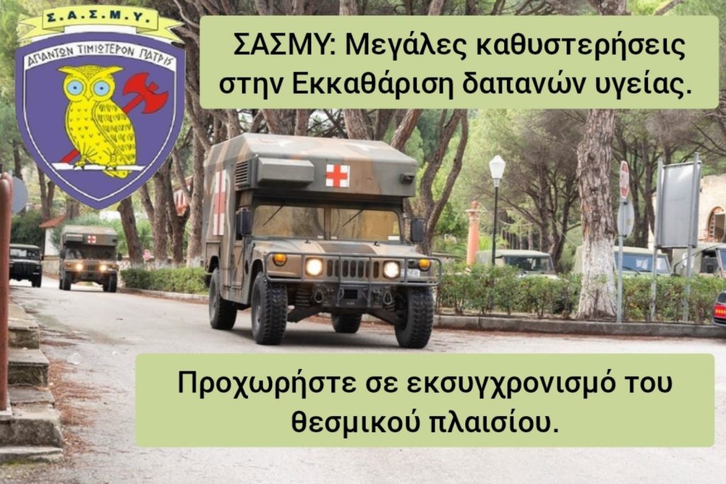 Ο ΣΑΣΜΥ(Σύνδεσμος Αποφοίτων Σχολής Μονίμων Υπαξιωματικών) μετά από όχληση των μελών του συνέταξε το παρόν έγγραφο ώστε να αιτηθεί την συνδρομή σας για την βελτίωση του χρόνου εκκαθάρισης δαπανών υγείας αλλά και την βελτίωση των παρεχόμενων υπηρεσιών υγειονομικής περίθαλψης με την βελτίωση και εκσυγχρονισμό του υπάρχοντος νομοθετικού πλαισίου.