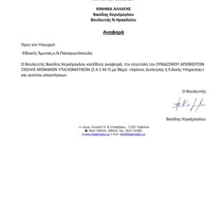 Οι Βουλευτές, κ. Βασίλης Κεγκέρογλου, Κώστας Σκανδαλίδης Γιώργος Φραγγίδης και Γιώργος Μουλκιώτης καταθέτουν ως αναφορά την επιστολή του Συνδέσμου Αποφοίτων Σχολής Μόνιμων Υπαξιωματικών (Σ.Α.Σ.Μ.Υ) σχετικά με ασφαλιστικά και συνταξιοδοτικά αιτήματά...