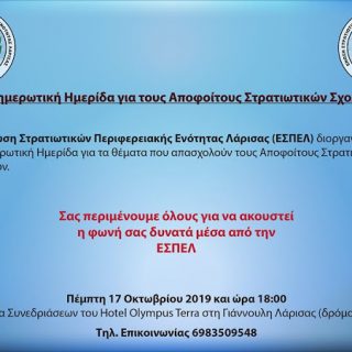 Την Πέμπτη 17.10.2019 στη Λάρισα πραγματοποιήθηκε από την ΕΣΠΕ ΛΑΡΙΣΑΣ ημερίδα αποφοίτων ΑΣΣΥ, με κατ’ εξοχήν ενημέρωση τη σύσταση του Σώματος Υπξκων, καθώς επίσης και λοιπών θεμάτων που ταλανίζουν την...